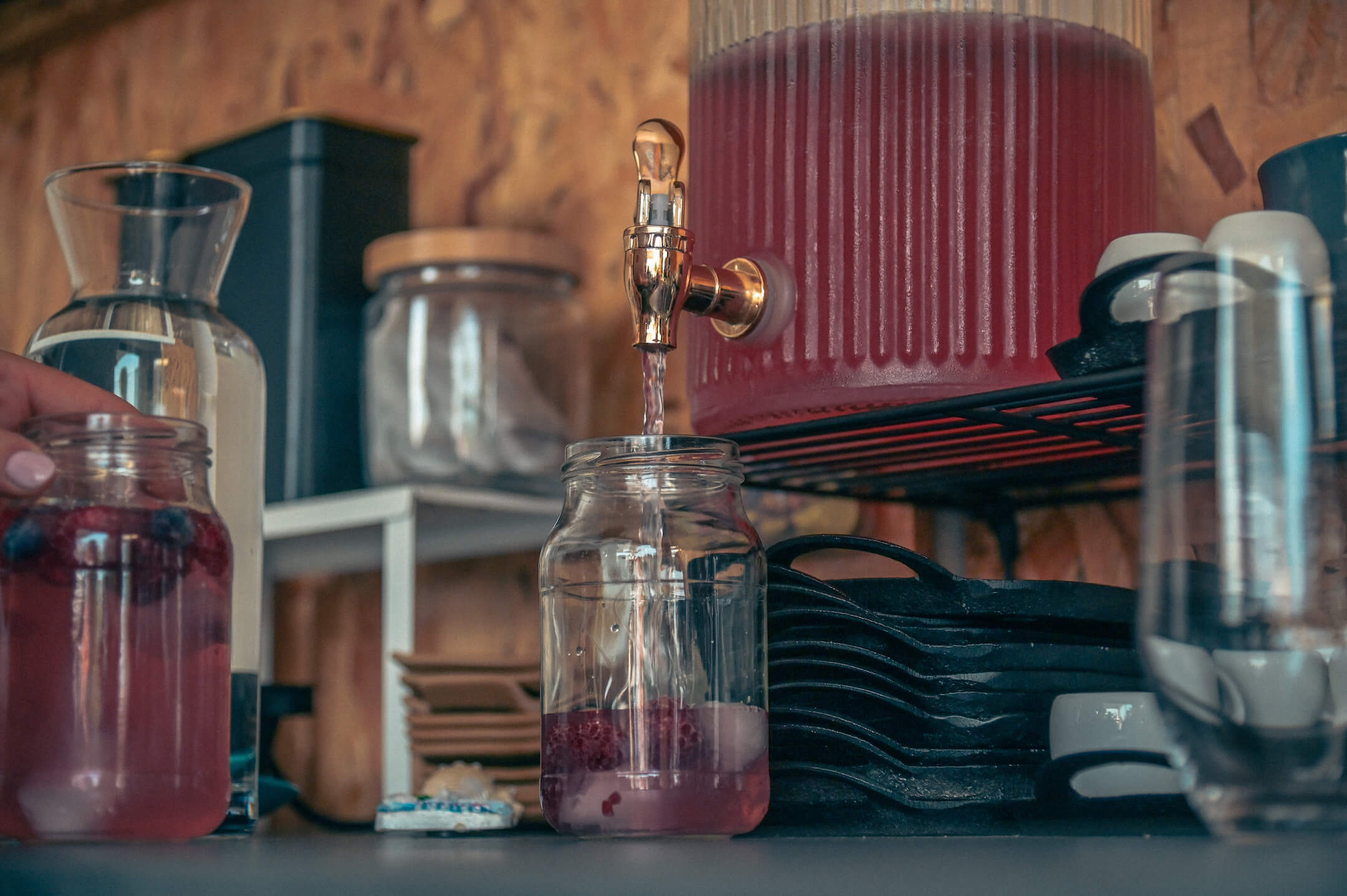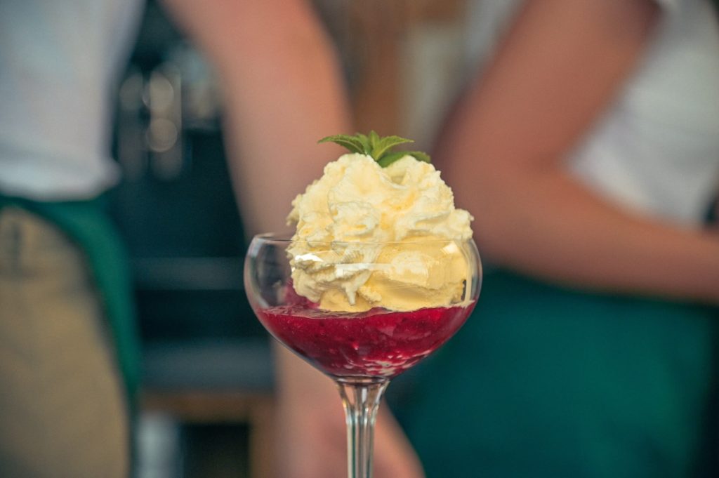 Ponudba zajema domače Gjergjekove sokove, domače limonade, otroške koktaile, sezonske brezalkoholne in alkoholne pijače, lokalna piva, hišno vino, ki ga zavijemo tudi v malinine barve, pa vina in penine Radgonskih goric. Nikoli nam ne zmanjka prekmurske gibanice ali sladoleda, ki ga lahko zavijemo v zelene, bučne odtenke ali ga pripravimo v najbolj pisanih mrvicah, da navdušimo otroke. Postrežemo pa tudi kaj malega “za pikniti". Vedno sledimo sezoni in dodajamo jedi in pijače, ki nas takrat nagovorijo - recimo iz vrtnice, sivke ali konoplje.