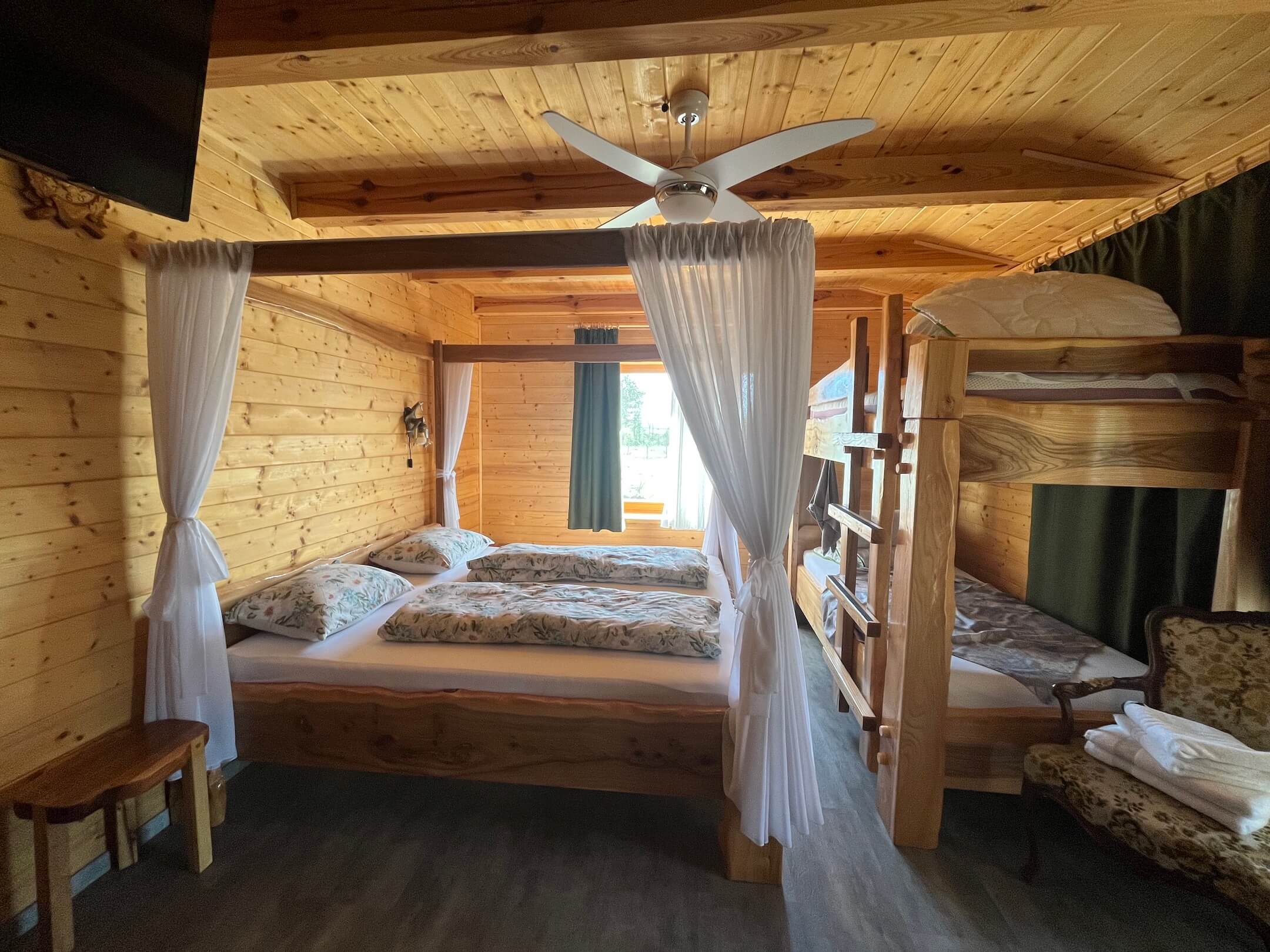 Sobe so za 4 osebe, opremljene z masivnim pohištvom, lastno kopalnico in teraso s pogledom na živalsko oboro.